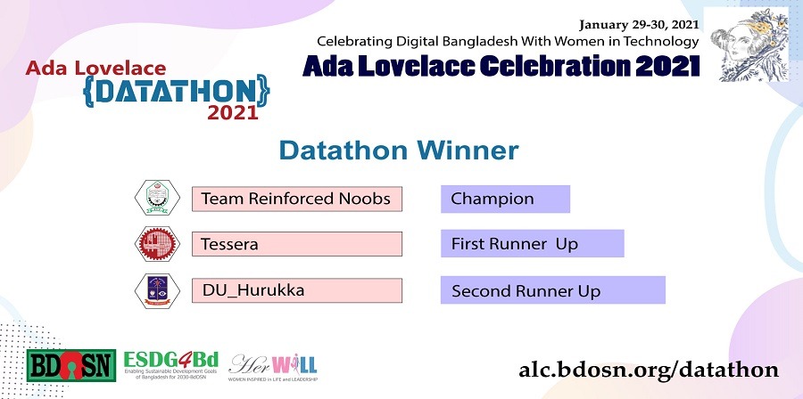 ডাটাথন প্রতিযোগীতায় বিজয়ী ঘোষণার মধ্য দিয়ে শেষ হল দুইদিনের অ্যাডা লাভলেস সেলিব্রেশন-২০২১। চূড়ান্ত প্রতিযোগীতায় মোট ৩৭টি দল থেকে তিনটি দলকে বিজয়ী ঘোষণা করা হয়। বিজয়ীরা হলেন, চ্যাম্পিয়ন দল টিম রিইনফোর্সড নুবস, প্রথম রানার আপ টেসেরা, দ্বিতীয় রানার আপ ডিইউ হুরুক্কা।চ্যাম্পিয়ন দল ইসলামিক ইউনিভার্সিটি অব টেকনোলজি, প্রথম রানার আপ বুয়েট এবং দ্বিতীয় রানার আপ ঢাকা বিশ্ববিদ্যালয়। চ্যাম্পিয়ন দল ১৫ হাজার টাকা, প্রথম রানার আপ ১০ হাজার টাকা এবং দ্বিতীয় রানার আপ পাবেন ৫ হাজার টাকা।