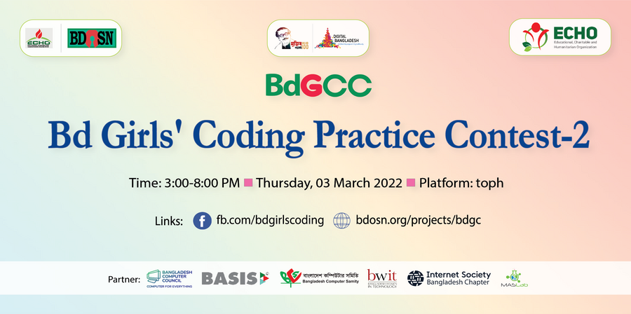 গত ০৩ মার্চ ২০২২ তারিখে অনুষ্ঠিত হল "বিডি গার্লস কোডিং প্র্যাকটিস কন্টেস্ট-২"। প্রোগ্রামিংয়ের এই প্রস্তুতিমূলক প্রতিযোগিতাটির সময়কাল ছিল বিকাল ৩ টা থেকে রাত ৮ টা পর্যন্ত মোট ৫ ঘন্টাব্যাপী এবং মোট ৬৪ জন হাইস্কুলগামী মেয়ে শিক্ষার্থী এই প্রতিযোগিতায় অংশগ্রহণ করে।