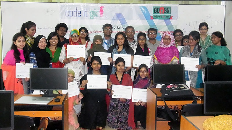 Workshop on "Introduction to algorithms and how to apply them in computer programming" held successfully in the Charle Babage lab of Daffodil International University (DIU) on 5-6 June 2015. BdOSN in collaboration with Code it, Girl organized the workshop for the girls. DIU hosted the workshop. 18 female students from Dhaka University, BUET, North South University, Jahangirnagar University, National University etc joined the workshop. Bristy Sikder, a student of Massachusetts Institute of Technology (MIT) conducted the workshop while Mirfat Sharmin and All Rabbi of BdOSN facilitated the same. The workshop covered the basic algorithm required for computer programming. Students learned the basics and application of Ad-Hoc Problems, greedy algorithms, Divide and Conquer: Merge Sort, Graphs, BFS, DFS, Jug Problem, etc.