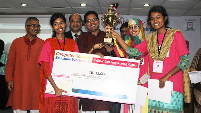 63 teams consisting of 3 girls in each team from across the country mark the successful completion of National Girls Programming Contest (NGPC)-2015 held on 12th December at Daffodil International University campus Dhaka. SUST Twinkle, solving four out of six problems became the champions while CUET Sparkles and DU Team 1 became first and second runner up respectively. Advocate Zunaid Ahmed Palak, MP honourable state minister of ICT handed over the prizes to the winners. Codewizerd of 3 high school girls tops among the high school category. A special prize was also awarded to the youngest team from Netrokana. The three members were 10, 11 and 11 years old.