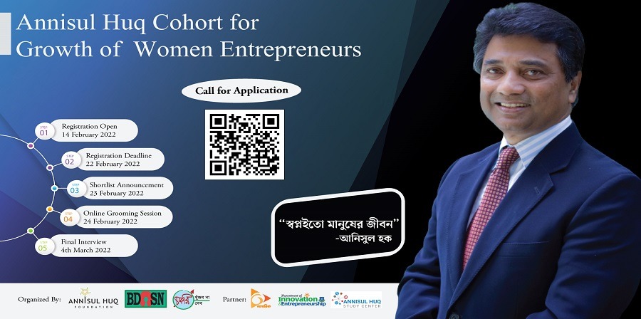 প্রয়োজনীয় তথ্য ও গাইডলাইন, আর্থিক ও মানসিক সাপোর্ট এবং প্রোডাক্ট, মার্কেট ও আর্থিক ব্যবস্থাপনায় প্রশিক্ষণ নারী উদ্যোক্তাদের পরবর্তী ধাপে উত্তরণের সহায়ক। তাই এসব খাতে সংশ্লিষ্টদের এগিয়ে আসা প্রয়োজন। ঢাকা উত্তরের প্রয়াত মেয়র আনিসুল হকের নামে নারী উদ্যোক্তাদের একটি কোহর্টের উদ্বোধন অনুষ্ঠানে অতিথি ও অংশগ্রহণকারীগণ এই মত ব্যক্ত করেছেন। ১৮ মার্চ শুক্রবার ঢাকার ড্যাফোডিল এডুকেশন নেটওয়ার্ক বিল্ডিং এর ৭১ মিলনায়তনে এই কার্যক্রমের শুভ উদ্বোধন করেন আনিসুল হক ফাউন্ডেশনের প্রতিষ্ঠাতা ও এশিয়ান ইউনিভার্সিটি ফর উইমেনের উপাচার্য ড. রুবানা হক। আনিসুল হক ফাউন্ডেশন, বাংলাদেশ ওপেন সোর্স নেটওয়ার্ক (বিডিওএসএন) ও চাকরি খুঁজব না চাকরি দেব গ্রুপের যৌথ আয়োজনে ৭ মাস ব্যাপী এই কোহর্টে ৩৪ জন নারী উদ্যোক্তা অংশগ্রহণ করছে। সহযোগিতায় রয়েছে ড্যাফোডিল ইন্টারন্যাশনাল বিশ্ববিদ্যালয়ের আনিসুল হক স্টাডি সেন্টার, ইনোভেশন এন্ড অন্ট্রোপ্রেনিওরশিপ ডিপার্টমেন্ট এবং নাগরিক টিভি।