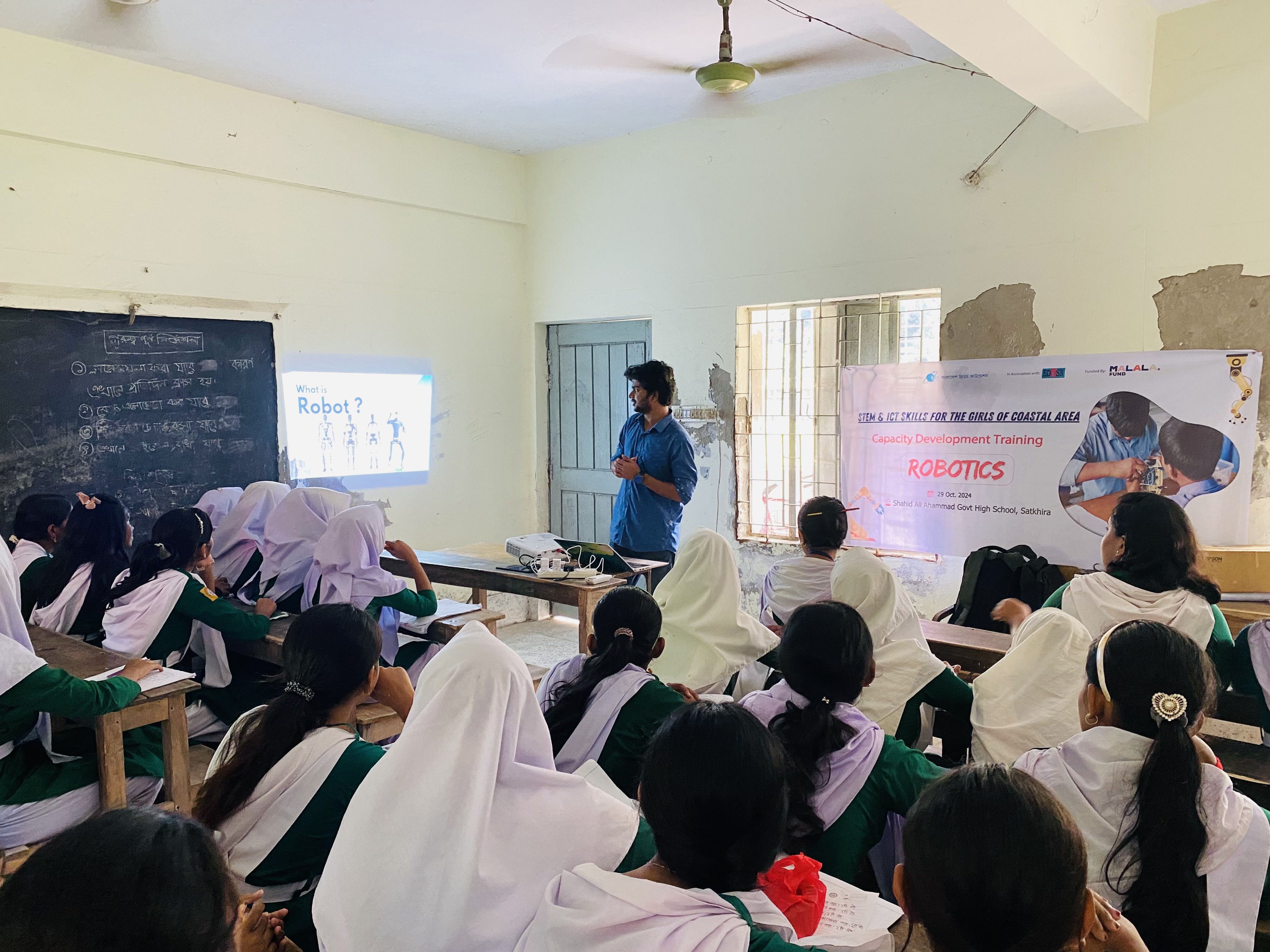 Robotics sessions were conducted in Shahid Kamel Model High School and Shahid Ali Ahammad Govt. Girls High School at Tala, Satkhira. The robotics workshop led by Mr. Afridey provided an interactive and practical experience for 41 enthusiastic students, designed to immerse them in the fascinating realm of robotics and the foundational principles of electronics.