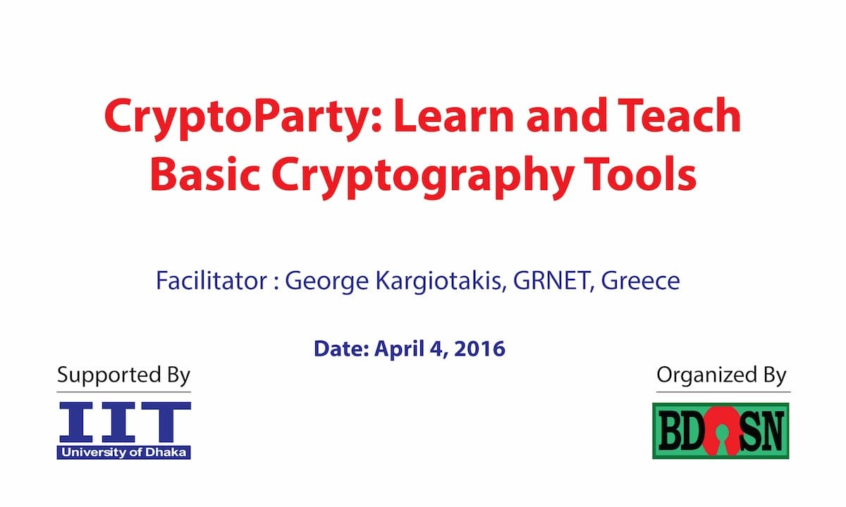 Bangladesh Open Source Network (BdOSN) organize a workshop on Basic Crypography Tools. The hands on activity titled "CryptoParty: Learn and Teach Basic Cryptography Tools." will be held on 4th April, Monday at 5.00 pm. The venue of the workshop is the computer lab of Institute of Information Technology, Dhaka University.