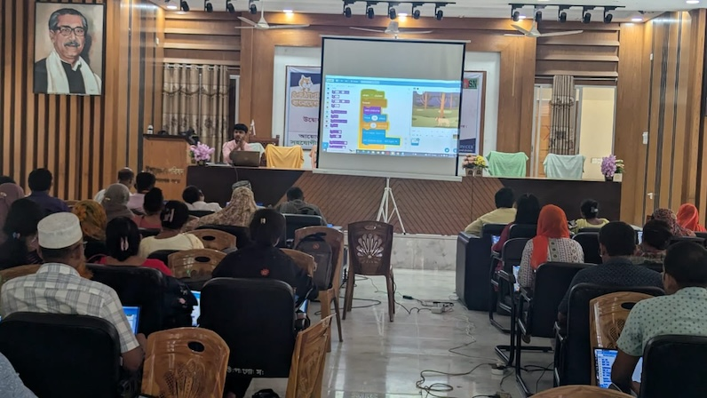 A training workshop on scratch programming was held with the participation of a total of 226 teachers of Sadar Upazila at Gopalganj Sadar Upazila Parishad Auditorium in two phases. One ICT teacher each from 113 government primary schools participated in each phase of the workshop held on July 5-6 in the first phase and July 12-13 in the second phase.