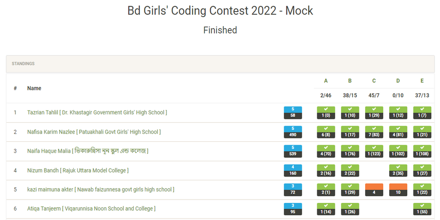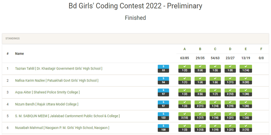 সারাদেশের বিভিন্ন স্কুলের মেয়ে শিক্ষার্থীরা প্রোগ্রামিংয়ের এই প্রতিযোগিতায় অংশগ্রহণ করে। প্রতিযোগিতার সেরা ৩০ জনের তালিকা নিচে দেওয়া হল।